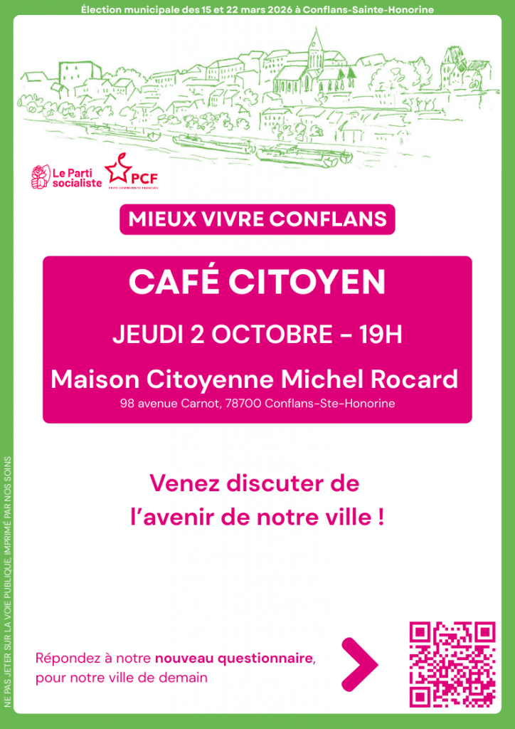 J’ai le plaisir de vous annoncer la tenue d’un nouveau Café Citoyen, le jeudi 2 octobre à la Maison citoyenne Michel Rocard de Conflans-Sainte-Honorine.