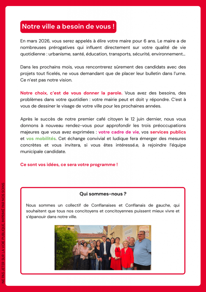 Organisé par le Parti Socialiste Section Conflans-Sainte-Honorine et le PCF 78 – Section de Conflans Ste Honorine, ce moment d’échanges changera de formule pour vous permettre de préciser les besoins que vous avez exprimés en juin, les tester sur des cas pratiques et les traduire en mesures concrètes du programme.